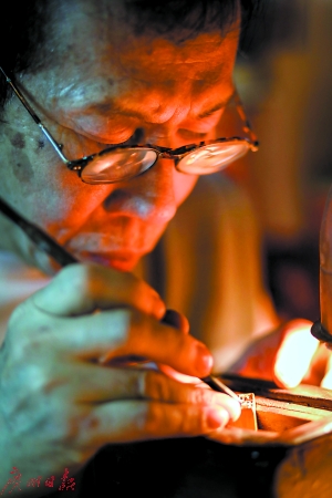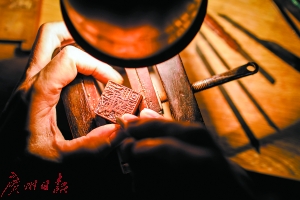 燙金絲印、公章膠印、原子印章……在和平西路9號(hào)有一家毫不起眼的刻章店——秋記刻章工藝,這里記錄著一段百年三代人的篆刻家族史。19世紀(jì)末期,叔公項(xiàng)信南隨著戲班來(lái)到廣州,成為一位金石篆刻名家;20世紀(jì)初,幼年喪父的項(xiàng)少南來(lái)到省城投奔叔叔項(xiàng)信南,也成為知名篆刻藝人,直到90歲高齡仍篆刻不輟;上世紀(jì)60年代,項(xiàng)少南之子項(xiàng)頌秋子承父業(yè),如今已入行57年。如今,隨著機(jī)器刻章的興起,從秋哥變成秋叔的71歲項(xiàng)頌秋卻面臨著手藝失傳?!叭绻幸懔Φ娜讼雽W(xué),我愿意免費(fèi)教學(xué)。”他說(shuō)。
