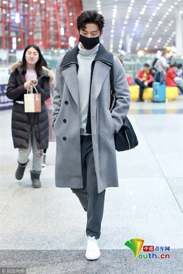 ??2017年12月13日,北京,竇驍身著灰色大衣、戴口罩現(xiàn)身機場,為粉絲大方簽名,見鏡頭開心比V揮手親和力滿分。