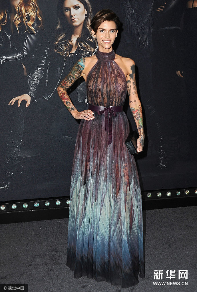 ??? 近日,美國好萊塢,眾明星參加電影《完美音調(diào)3》首映禮。 魯比·洛斯(Ruby Rose)身穿漸變深紫色削肩掛脖透視蕾絲紗裙,系紫色腰帶,手拿黑色亞克力手拿包。