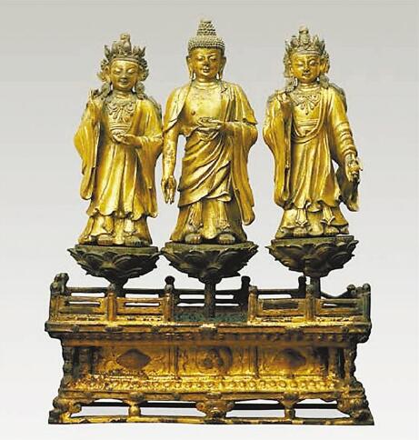 ▲清中期鎏金銅西方三圣像。