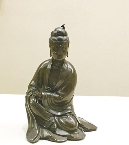 其中,最引人注目的莫過于展覽海報上呈現(xiàn)的“景德鎮(zhèn)白釉瓷塑觀音菩薩像”,產(chǎn)于南宋時期,整尊瓷塑構(gòu)思既簡約又精巧,以粗線條捏塑形體與衣紋,胸前瓔珞精致,人物形象傳神,充分展現(xiàn)了宋代瓷塑藝術(shù)的審美意韻與高超技藝。令人嘖嘖稱贊的還有明中晚期的“銅觀音菩薩像”。此像采用暹羅國(今泰國)所貢優(yōu)質(zhì)風(fēng)磨銅鑄造,工藝精細(xì),撫之如嬰兒肌膚,嵌銀絲,背后銀絲鑲嵌方章銘款“石叟”二字,當(dāng)出自石叟本人之手。據(jù)了解,石叟為明代晚期鑄銅塑像名匠,僧人身份,現(xiàn)存中晚明觀音銅像中尚有部分“石叟”款,真品珍貴稀罕。
