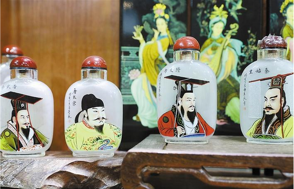 談及創(chuàng)作過程,楊藝說,鼻煙壺內(nèi)畫的制作,一般是在水晶壺或素玻璃壺內(nèi)壁,用特制的細筆,蘸取少許墨汁顏料,從小口中深入瓶中,反手作畫。創(chuàng)作內(nèi)畫,在常人看來,不可思議之處是有限的空間以及需要反手作畫,這也是每一個內(nèi)畫師面臨的主要難題所在,“創(chuàng)作內(nèi)畫時,需要在這盈寸天地間做到手指和筆桿揮灑自如,這極其考驗一個人的耐性。一手執(zhí)壺,一手作畫,作畫時需要在壺內(nèi)反手描繪,如此,才能讓人們在外部看到正面的畫像結(jié)構(gòu)?!眱?nèi)畫的難度還在于,要長期低頭畫畫,因此還導(dǎo)致頸椎疼痛,中途為了治療疼痛休畫了好長一段時間。