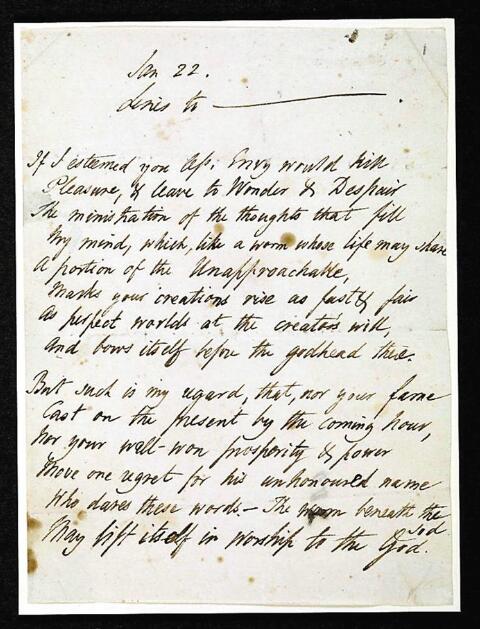 ▲珀西·比?!ぱ┤R的《致拜倫的十四行詩》草稿。