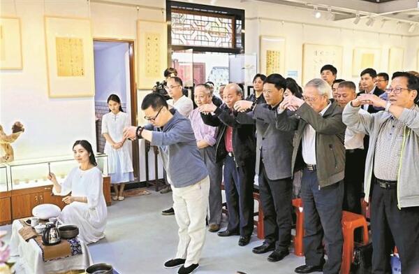 絲竹管弦伴著《詩經》吟誦,古雅之風貫穿了古今。當天除了慕雅思古之外,亦有崇賢。參加活動的眾人,向書圣王羲之的畫像作揖、致敬。羅烈杰、盧紹武、李靜現(xiàn)場做了熱情洋溢的講話,他們鼓勵書界同仁要團結努力,既要繼承傳統(tǒng)、又要推陳出新,不斷弘揚中華民族的優(yōu)秀文化。禮畢后,著名古琴家高建國現(xiàn)場操琴。除此之外,還有精彩的茶藝、二胡表演等等。