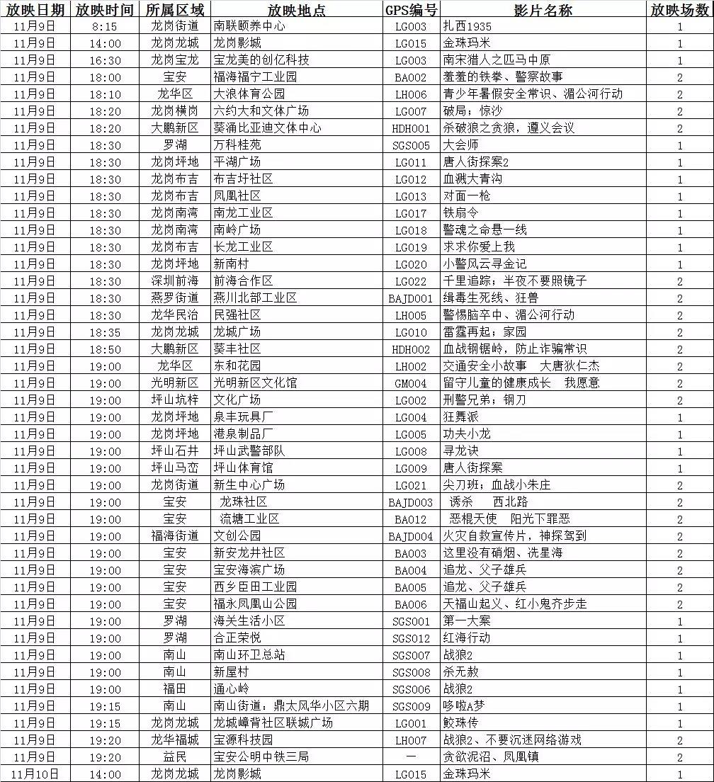 【深圳市萬場電影惠百姓】今晚11月9日(星期五)露天免費放映電影安排