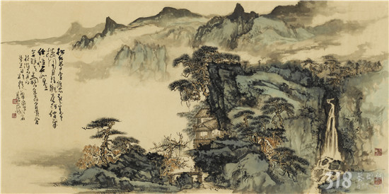 范陽(yáng)先生的山水畫(huà),筆法近取傅抱石、黃秋園,遠(yuǎn)溯“元四家”中黃公望、王蒙。筑居楊岐山下,使先生日夜親近自然山水,吐納天地,養(yǎng)浩然之氣?!巴鈳熢旎?,中得心源”,唐代張璪一言道破了山水畫(huà)家修養(yǎng)、悟性的不二法門。范陽(yáng)先生正是以自然(造化)為營(yíng)養(yǎng),入而為心靈化育,镕冶成亦古亦新,遠(yuǎn)離塵俗的獨(dú)特風(fēng)格。近作《松風(fēng)泉聲》(五屏聯(lián))氣勢(shì)磅礴,大開(kāi)大合,細(xì)究又十分謹(jǐn)嚴(yán)。筆墨與丘壑融為一體,既豪放又穩(wěn)健。淺絳青綠的設(shè)色,使畫(huà)面有蔥翠欲滴之感。堪稱山水畫(huà)中的經(jīng)典。