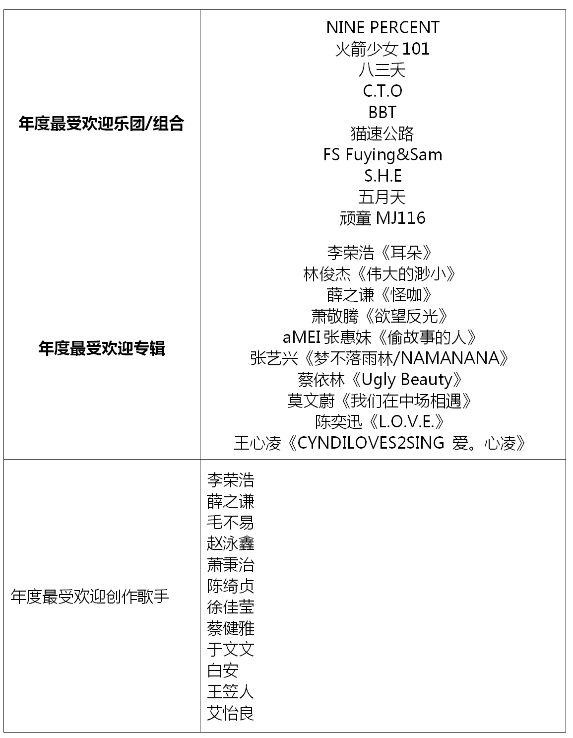 “年度最受歡迎樂隊/組合”入圍名單中,同在2018年成功舉辦巡回演唱會的五月天、S.H.E等老牌組合的進榜,讓大家看到了華語樂壇常青樹的非凡音樂實力;八三夭、C.T.O、BBT、FS Fuying&Sam、頑童MJ116等組合,憑借不減反升的人氣魅力實力進榜;而NINE PERCENT、火箭少女101及貓速公路等新人組合的二次入圍,不僅僅是對他們在音樂成績上的肯定,更是對其未來之路的鼓勵。