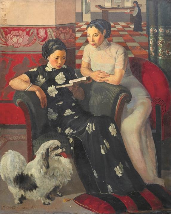 在林林總總的160件展品中,懸放在展廳最顯著位置的是常書鴻的大尺幅油畫《客廳中的姐妹》。這幅作品創(chuàng)作于1936年,當(dāng)年榮獲法國國家沙龍銀獎,隨后被一位法國藏家購得,作為家族永久收藏。去年,龍美術(shù)館在競拍中以重金將其購得。