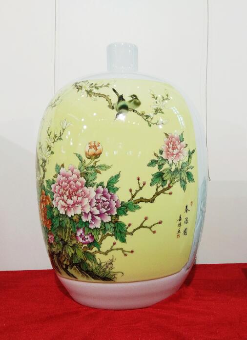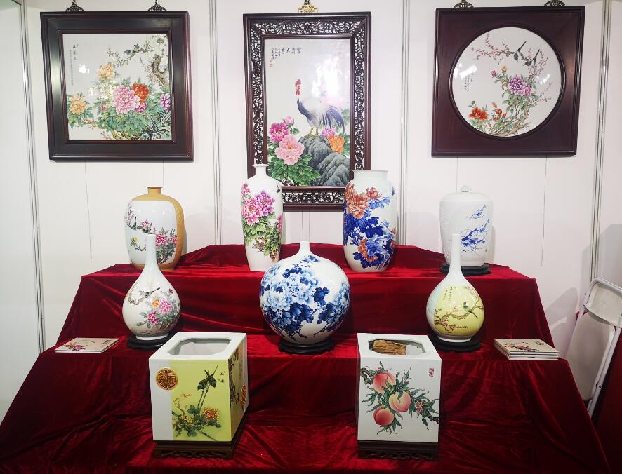 江西省陶瓷技能大師、江西省高級(jí)工藝美術(shù)師、惲派花鳥第十二代傳人、景德鎮(zhèn)青年陶瓷藝術(shù)家劉嘉鴻此次展會(huì)展出的陶瓷藝術(shù)作品共計(jì)35件,包含瓷板畫、瓷瓶、瓷盤、青花瓷、青花斗彩瓷等,其中《春滿園》、《錦堂富貴》、《長(zhǎng)壽圖》等作品呈現(xiàn)陶瓷技藝,展示出劉嘉鴻深厚的藝術(shù)造詣。