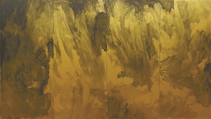 此次展出的作品《山外之山中》泥金四條屏令人耳目一新。他借助屏風(fēng)的形式,使用泥金這一材料,以大開(kāi)大闔的磅礴氣勢(shì),展現(xiàn)了蘇軾筆下“不識(shí)廬山真面目,只緣身在此山中”的意境。