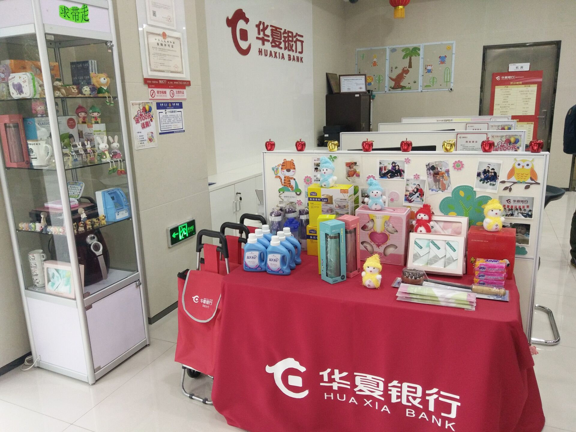 這是銀行?在記者走進這家銀行的門店時,有些遲疑。進門口陳列著一件件精美的禮品,“求帶走”的小標語,閃閃惹人愛,環(huán)顧下四周,確實是銀行的辦公柜臺,網點雖小,但五臟俱全,與其說是銀行,這里的整體布局更像是一個溫馨、充滿童趣的小家。