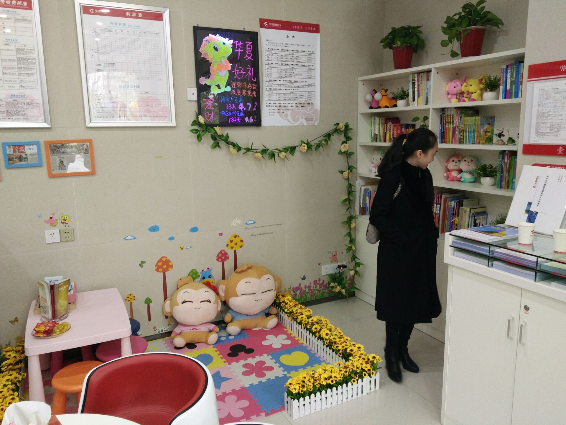 記者發(fā)現,除了便捷的金融設施,在每一位員工的辦公座前,都擺放著一個電子相冊,上面滾動播放著一些孩子的笑臉照或親子游戲照等,畫面間流露著快樂。其中,在一位工作人員辦公桌的側板上,快樂的笑臉照被打印出來,集滿了整張墻。據工作人員表示,這些照片大多都是客戶在參與支行組織的活動時留下來的,不知不覺,就匯聚成了現在的照片墻。除此之外,網點內還設有圖書角、兒童樂園等,開放給社區(qū)居民使用,提高顧客的服務體驗,有些家長帶孩子來辦理物業(yè)時,就感覺像回到了自己另外一個家一樣。