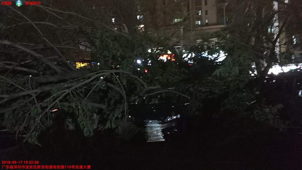 坐標寶安,17日晚,95589接到客戶報案車輛被大樹壓砸,接到報案后查勘員3分鐘內聯(lián)系客戶,指引理賠手續(xù)。15分鐘內到達現場。指引客戶到太平財險合作車行進行維修。
