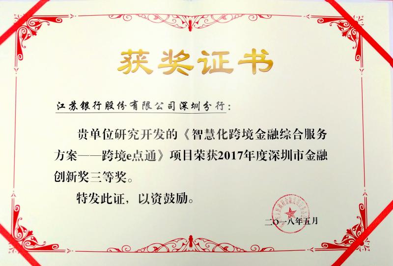 深圳新聞網(wǎng)訊 日前,深圳市政府2017年度金融創(chuàng)新獎評選結(jié)果揭曉,江蘇銀行深圳分行“智慧化跨境金融綜合服務(wù)方案—跨境e點通”項目斬獲三等獎,這是該行連續(xù)四年獲得金融創(chuàng)新獎后再次獲此殊榮,該行也由此成為深圳地區(qū)唯一一家五次榮獲金融創(chuàng)新獎的城商行。