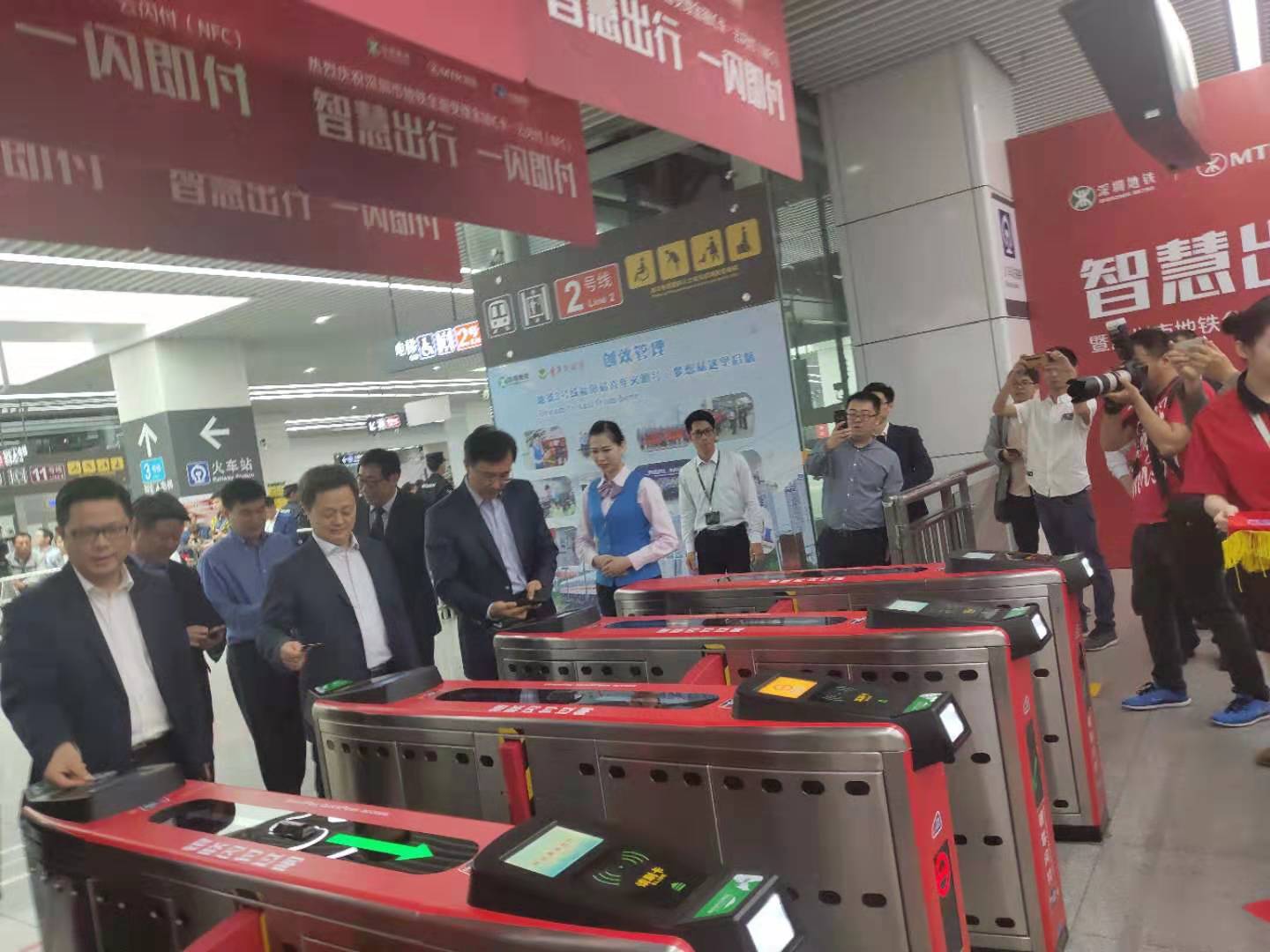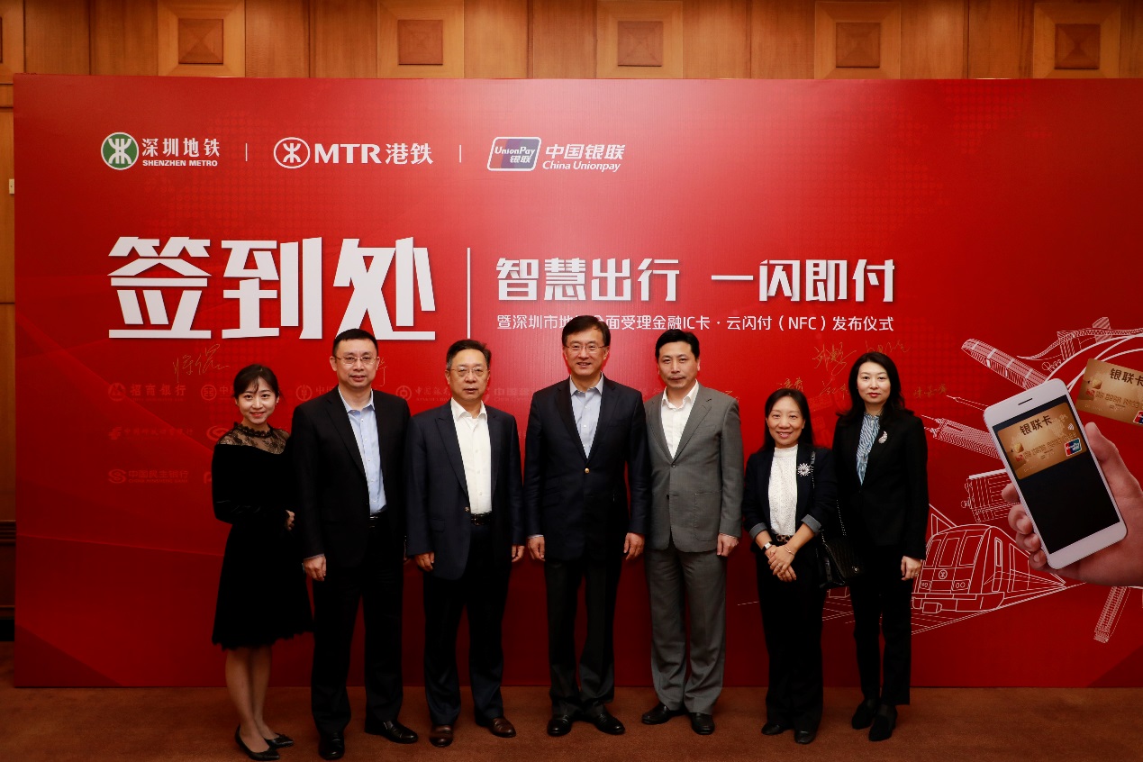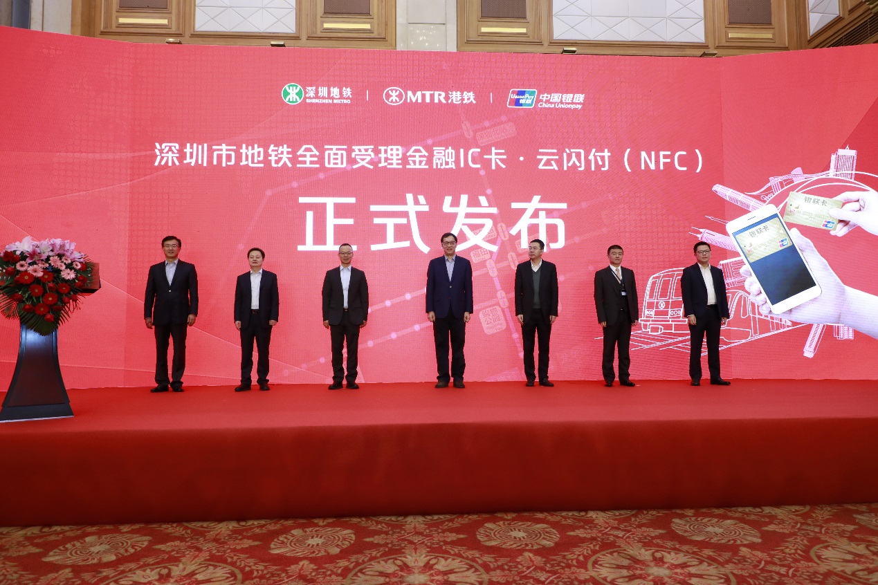 3月1日上午,五洲賓館內(nèi)舉行了“深圳市地鐵金融IC卡過閘服務(wù)”的啟動儀式。中國人民銀行副行長范一飛、深圳市人民政府副市長艾學峰、招商銀行總行副行長劉建軍、中國銀聯(lián)董事長邵伏軍、招商銀行深圳分行行長岳鷹、深圳地鐵董事長辛杰、港鐵(深圳)總經(jīng)理黃琨暐等相關(guān)領(lǐng)導出席了啟動儀式,并共同點亮LED燈幕,宣告深圳市地鐵8條線路的所有車站正式啟用過閘功能。