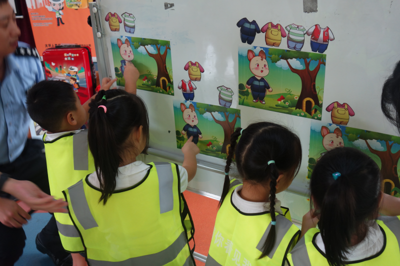 熊警官從交通工具講起,分別講述了乘坐不同交通工具所帶來的風(fēng)險(xiǎn)及注意事項(xiàng),并通過幽默風(fēng)趣的“兒童安全座椅”小視頻,提醒在座的小朋友及家長要注意細(xì)節(jié),具有防范風(fēng)險(xiǎn)的意識。在互動游戲環(huán)節(jié),熊警官通過與小朋友們的互動,講解了紅綠燈的來源、日常的交通標(biāo)識以及過馬路的規(guī)則。現(xiàn)場的同學(xué)們也非常踴躍,在“被看見才安全”環(huán)節(jié)時(shí),許多小朋友主動上臺,給小兔子穿上最亮最顯眼的衣服,使其成為最靚的仔。