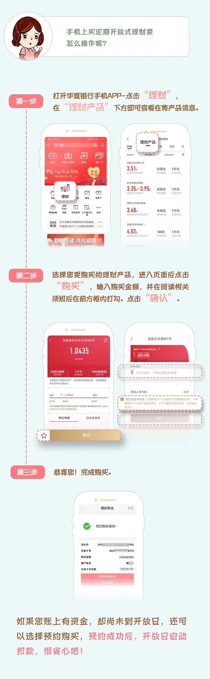 在購買理財(cái)產(chǎn)品前,首先要進(jìn)行風(fēng)險(xiǎn)評(píng)估,確認(rèn)您的風(fēng)險(xiǎn)承受能力,選擇與您風(fēng)險(xiǎn)偏好相匹配的理財(cái)產(chǎn)品。建議您務(wù)必詳細(xì)閱讀每一款理財(cái)產(chǎn)品說明書,了解該產(chǎn)品的風(fēng)險(xiǎn)、收益以及到賬時(shí)間等。