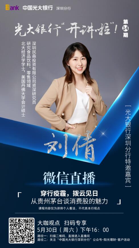 此次,光大銀行深圳分行攜手鳳凰深圳財(cái)經(jīng),邀請(qǐng)到北大經(jīng)濟(jì)學(xué)碩士、美國(guó)丹佛大學(xué)會(huì)計(jì)碩士、深圳民森投資有限公司資深研究員劉倩女士,在線為客戶帶來《穿行疫霾,拔云見日——從貴州茅臺(tái)看消費(fèi)股的魅力》主題分享。據(jù)悉,劉倩女士關(guān)注于食品飲料、零售領(lǐng)域的投資研究。此次分享,她以眾所熟知的茅臺(tái)酒為案例,結(jié)合A股2000年至2018年漲幅數(shù)據(jù)、茅臺(tái)歷史、品牌發(fā)展、銷售渠道、市場(chǎng)占有等多方面,介紹孕育牛股搖籃的消費(fèi)股投資邏輯,幫助更多客戶在全球受疫情沖擊、經(jīng)濟(jì)不確定時(shí)期,了解A股牛股市場(chǎng)邏輯、知曉投資策略提升個(gè)人資產(chǎn)。