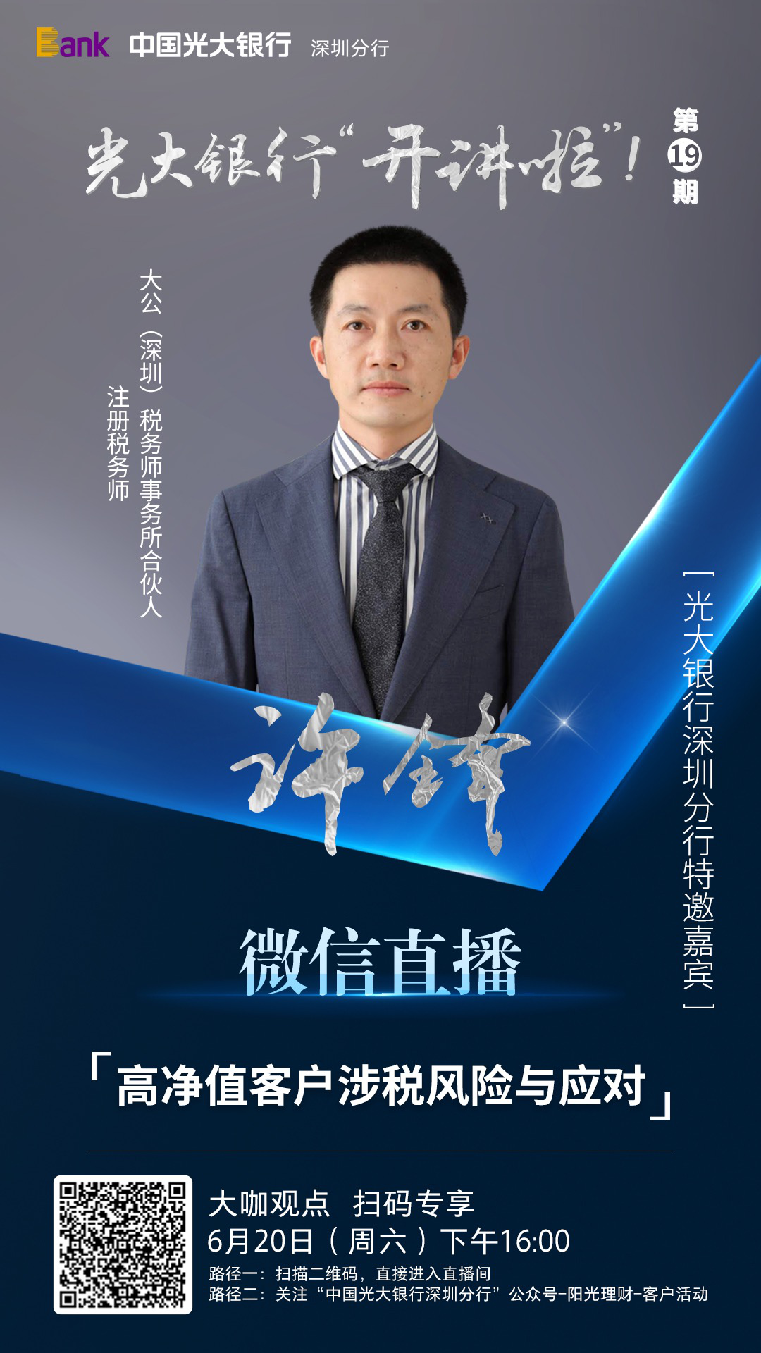 此次公益課堂邀請到大公(深圳)稅務師事務所合伙人、注冊稅務師許鋒,在線為客戶開講《高凈值客戶涉稅風險與應對》。他從當前稅務形勢及改革方向、征管變化、企業(yè)及高凈值個人稅務管理與籌劃等幾個層面開講,深入剖析了中國稅制特點;并列舉具體案例,結(jié)合當前稅收管理制度與政策,講解企業(yè)高管、高凈值人群在不動產(chǎn)投資、股權(quán)投資、公私混同的涉稅風險;剖析家族企業(yè)股權(quán)傳承中的稅務規(guī)劃,如何打破“富不過三代”的魔咒,以及在CRS全面啟動背景下,高凈值人士如何應對?幫助提示企業(yè)及高凈值人群,在稅務管理“全監(jiān)管”的時代,早做稅務規(guī)劃,規(guī)避稅務風險,做到“稅稅平安”。