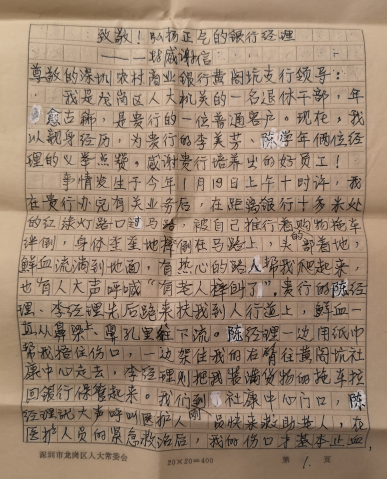 “事發(fā)第二天,該行行長(zhǎng)又派陳學(xué)年、李美芳兩位員工到我家探望、慰問,讓我全家非常感動(dòng)?!?月29日下午,傷口剛剛拆線的老人就帶著手寫的感謝信來到深圳農(nóng)商行黃閣坑支行,向幫助過他的兩位熱心人表達(dá)感謝之情。感謝信整整三頁(yè)紙,字跡工整,老人家的誠(chéng)摯感謝之意躍然紙上。