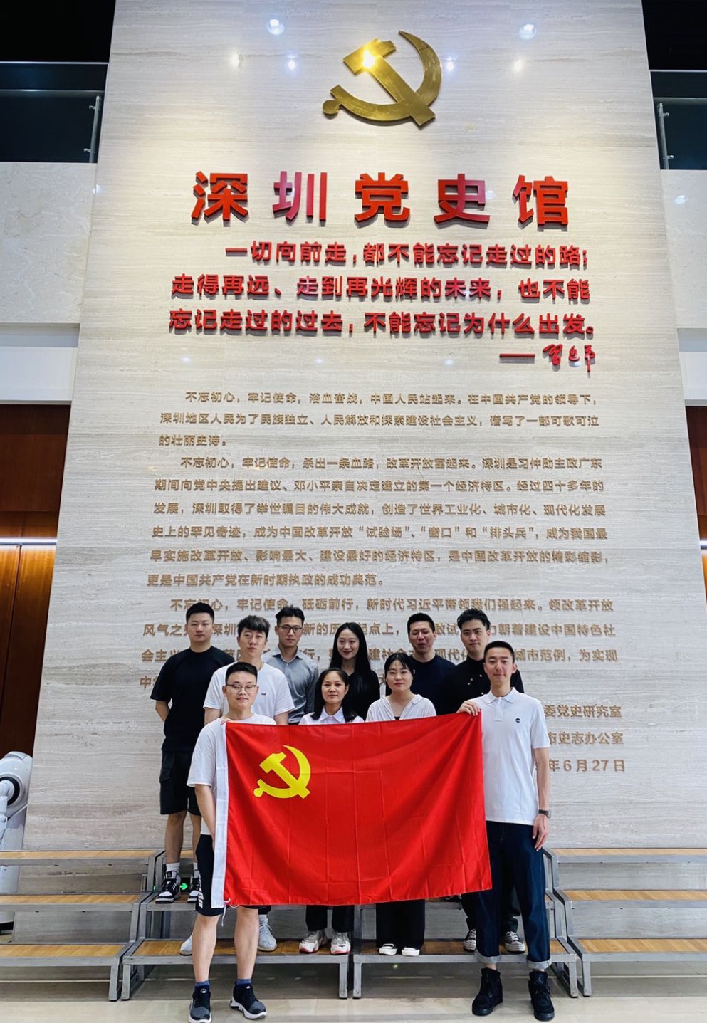 離開陵園,浦發(fā)銀行深圳分行的黨員們在深圳黨史館向青年員工介紹了深圳地區(qū)在中國共產(chǎn)黨領(lǐng)導(dǎo)下進行革命、建設(shè)和改革的不懈奮斗史以及取得的輝煌成就。大家一起在黨史館門口誦讀,“一切向前走,都不能忘記走過的路;走得再遠(yuǎn)、走到再光輝的未來,也不能忘記走過的過去,不能忘記為什么出發(fā)”。