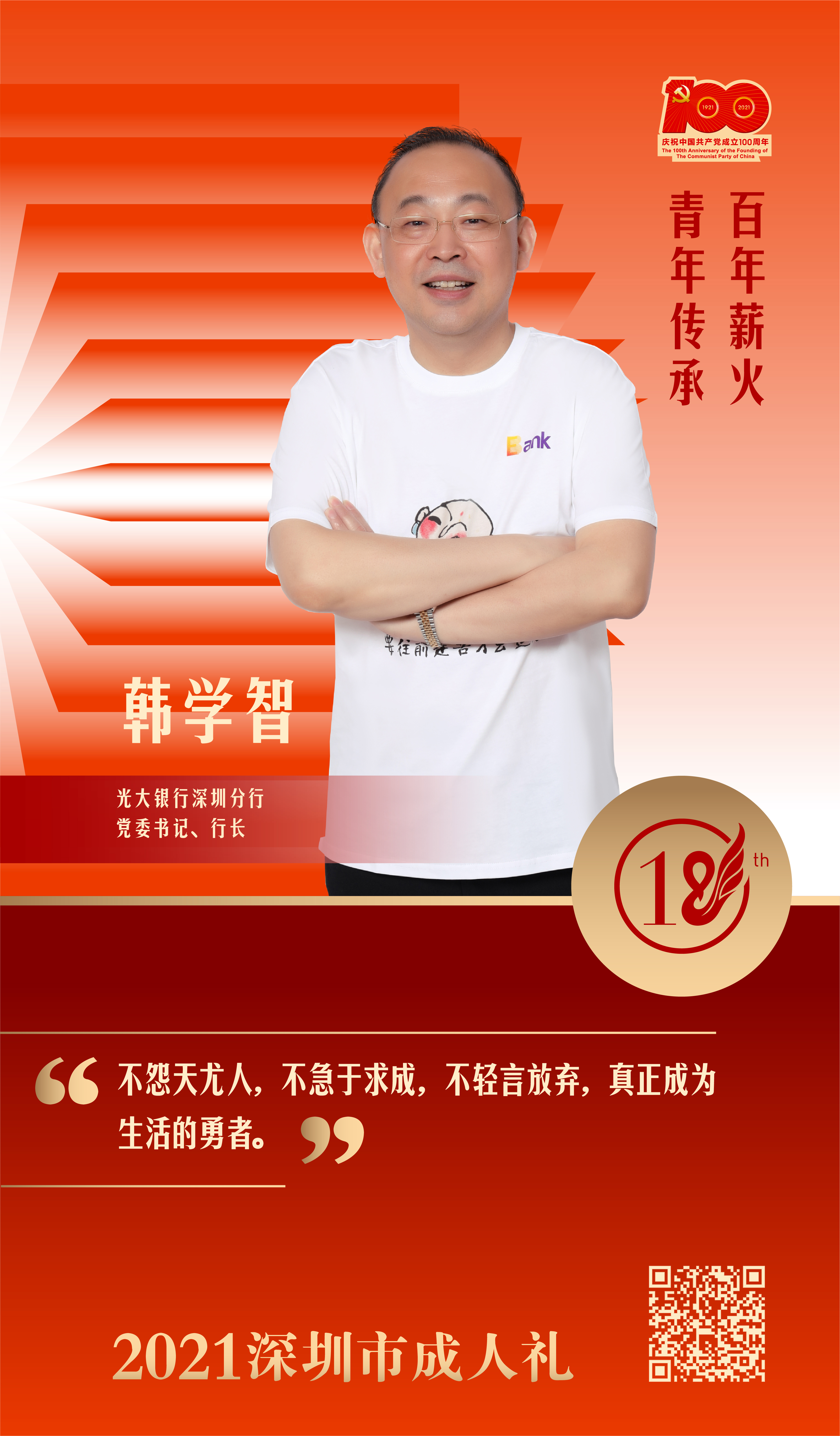 深圳新聞網(wǎng)·見圳客戶端2021年5月10日訊“以‘三勤四慎’提升青年生活幸福感,希望年輕人能勤于思考,善于思考,學會從思考中發(fā)現(xiàn)問題,解決問題,這樣才能取得更快的進步。”在5月7日拉開序幕的“百年薪火,青年傳承”2021深圳市成人禮系列活動中,光大銀行深圳分行黨委書記、行長韓學智作為青春代表,通過網(wǎng)絡渠道,為青年們送上飽含激情和期待的寄語“明信片”。