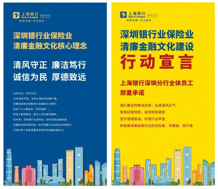 5月以來,上海銀行深圳分行按照深圳銀保監(jiān)局、深圳銀行業(yè)協(xié)會指導(dǎo)要求,秉持聯(lián)合性、統(tǒng)一性、持續(xù)性原則,統(tǒng)一啟動宣教行動日,在線上、線下等宣傳陣地多樣化宣傳標志性統(tǒng)一宣教文案,形成強烈的清廉金融文化宣教主題,營造濃厚宣教氛圍。統(tǒng)一在分行內(nèi)部電梯間LED屏、餐廳電視屏、各網(wǎng)點電視顯示屏等載體上投放清廉金融文化宣教視頻;統(tǒng)一在網(wǎng)點走馬燈展示“深圳銀行業(yè)保險業(yè)清廉金融文化核心理念—清風(fēng)守正、廉潔篤行、誠信為民、厚德致遠”等宣教標語;發(fā)布分行自制清廉金融宣教海報,充分加入自身特色理念,融入我行智慧金融,專業(yè)服務(wù)的理念,并組織各單位在公眾號、微信、朋友圈積極學(xué)習(xí)轉(zhuǎn)發(fā),形成宣教合力。