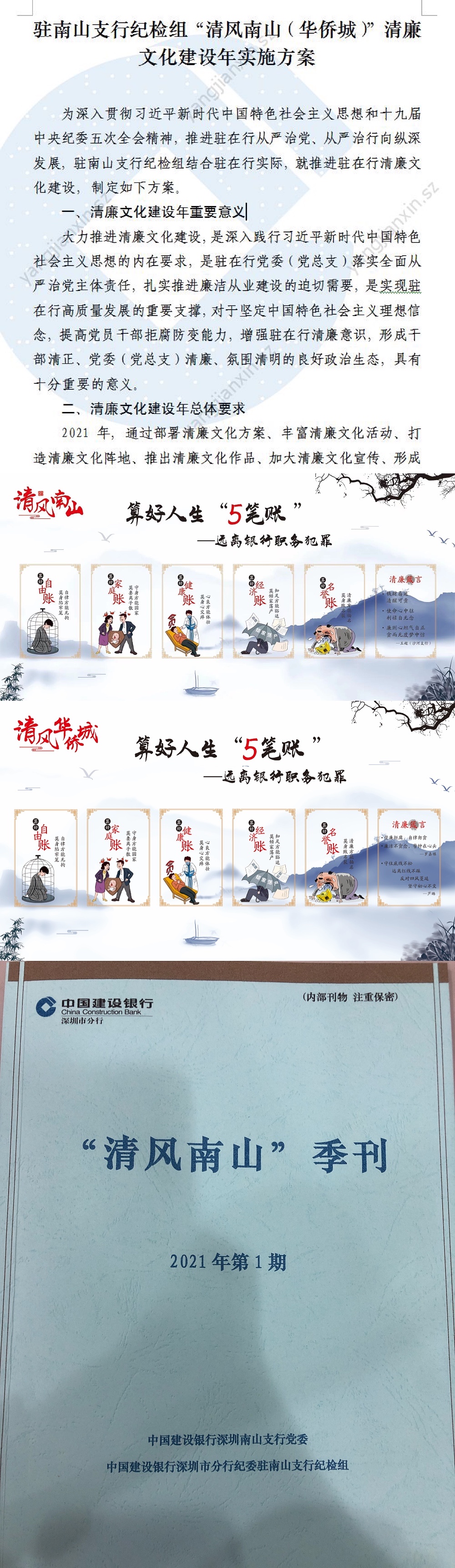 深圳新聞網(wǎng)6月9日訊 為充分發(fā)揮清廉文化的教育、激勵(lì)、凝聚、導(dǎo)向和約束作用,響應(yīng)深圳銀行業(yè)保險(xiǎn)業(yè)清廉金融文化核心理念,積極培育厚德養(yǎng)廉的政治生態(tài),著力助推駐在行干部清正、黨委清廉、政治清明、生態(tài)清朗的清廉文化建設(shè),近日,建行深圳市分行駐南山支行紀(jì)檢組制定推出了《“清風(fēng)南山(華僑城)”清廉文化建設(shè)年實(shí)施方案》。該方案以“6講”為依托,明確清廉文化建設(shè)5大任務(wù),即:弘揚(yáng)清廉價(jià)值理念、豐富清廉文化活動(dòng)、打造清廉文化陣地、推出清廉文化作品、攜手清廉文化共建。
