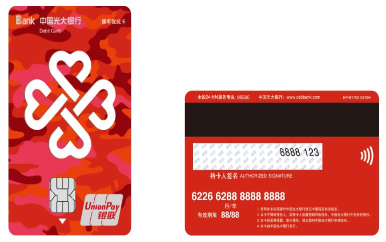 在金融服務(wù)產(chǎn)品方面,光大銀行面向軍人、退役軍人發(fā)行“擁軍優(yōu)撫”專屬聯(lián)名卡,優(yōu)撫對象可以憑軍官證、士兵證、退役證等有效證件在該行營業(yè)網(wǎng)點(diǎn)柜臺辦理賬戶開立并免收卡片工本費(fèi),“擁軍優(yōu)撫”專屬銀行卡在全國統(tǒng)一實(shí)現(xiàn)兩個專屬服務(wù)和十項優(yōu)惠政策。