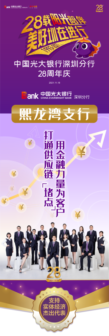 該支行始終秉承“客戶滿意,追求卓越”的價值觀,用金融力量為客戶打通供應(yīng)鏈“堵點”,與一大批優(yōu)質(zhì)企業(yè)建立了良好的合作關(guān)系。截止2021年11月,支行在分行內(nèi)對公客戶數(shù)量排名靠前。因此,在深圳分行28周年“十大最美光陰故事”評選中,熙龍灣支行榮獲支持實體經(jīng)濟杰出代表。