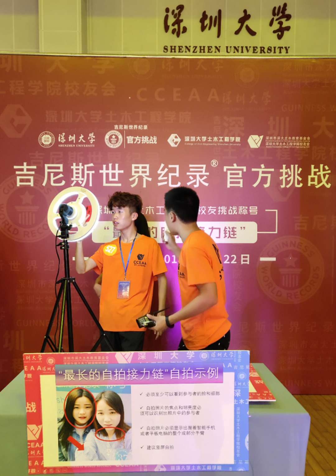 據(jù)悉,為慶祝今年深圳大學(xué)建校35周年,深大土木工程學(xué)院與深大土木工程學(xué)院校友會(huì)聯(lián)合組織師生、校友,挑戰(zhàn)“最長的自拍鏈條”吉尼斯世界紀(jì)錄挑戰(zhàn)活動(dòng)。當(dāng)天所有的自拍照片也將集合形成深圳大學(xué)LOGO,永久留存深圳大學(xué)檔案館,獻(xiàn)禮深大35周年校慶。校友企業(yè)永鑫集團(tuán)、南利裝飾、中德誠投資、深大巨成、龍影、大勝得特、特藝達(dá)裝飾、深建安工程對此次吉尼斯世界紀(jì)錄官方挑戰(zhàn)活動(dòng)提供了支持。