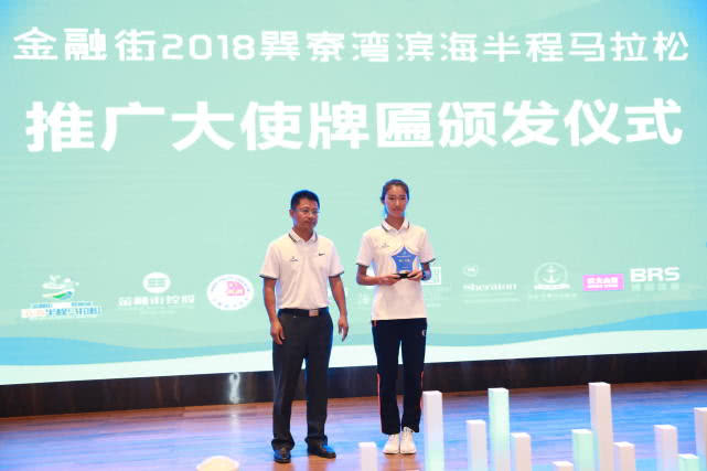 發(fā)布會(huì)上,金融街惠州置業(yè)有限公司總經(jīng)理梁成藝代表金融街2018巽寮灣濱海半程馬拉松籌委會(huì)給賽事代言人焦安靜頒發(fā)推廣大使牌匾。