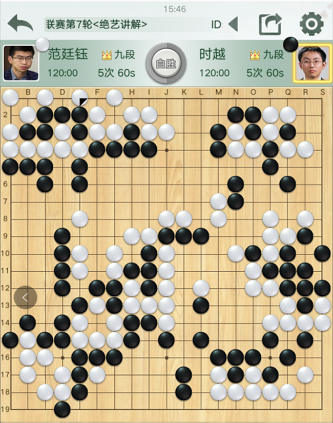 第二臺,時越執(zhí)黑對陣世界冠軍范廷鈺。開局白取地黑取勢,在中央的戰(zhàn)斗中,黑棋選擇開劫失誤,轉換后白棋勝勢。