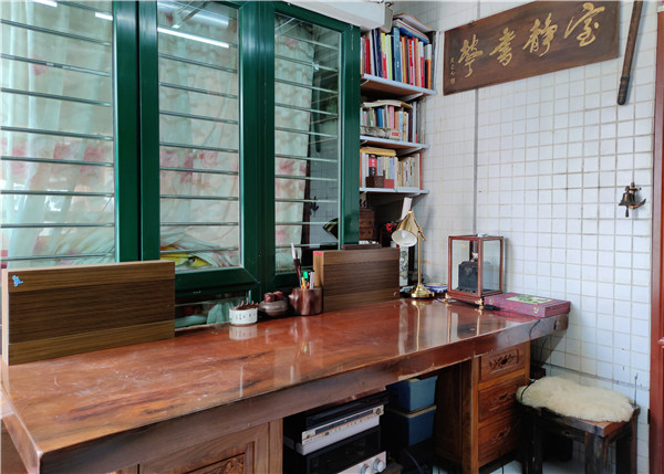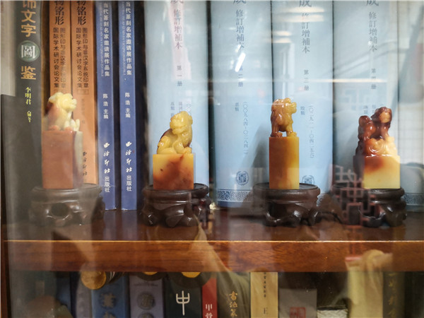 書房約莫20平米不到,擺設裝點里透射出寧老師的日常。當陽光照進這間寧靜的小屋,他習慣于先打開音樂,在舒心樂聲中開始他一天讀書、刻印的生活。累了,在小桌上喝喝茶,或彈上一段古琴,或者玩賞一下他收藏的心愛鈴鐺。據(jù)介紹,他專門收藏西北一帶富貴人家的馬鈴,目前有100余個。寧老師說,“讀書、養(yǎng)性、積德、延年”是其志向,井井有條、一絲不茍的書房就是佐證。長期的濡養(yǎng),讓人感到寧老師的談吐從容、情趣高雅、思想深刻。映照在篆刻上,寧老師的印作也日漸沉穩(wěn)大氣,除姓名印章外,所刻內(nèi)容啟人心智,如“以正大立心”“以光明行事”“修辭立其誠”等等。