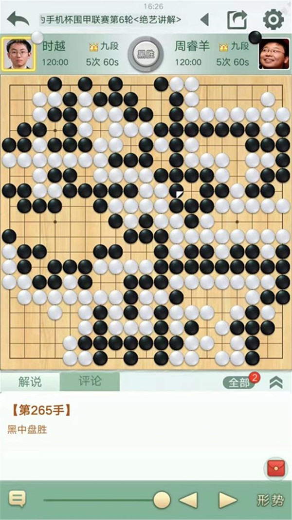 四臺時越執(zhí)白對陣世界冠軍周睿羊。中盤白棋侵消黑棋左上大模樣,黑棋付出很大代價強殺形成打劫。白棋劫爭中不夠細膩沒有擴大戰(zhàn)果而是聯(lián)絡(luò)成活,局面白稍有利。之后白棋左下連續(xù)下出緩手后局面接近。右下角黑棋二路夾試白應(yīng)手時白棋嚴(yán)重失誤,被黑棋奪走角地后局勢逆轉(zhuǎn)。