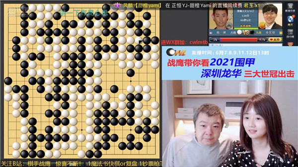 今日大局好,教練羅洗河心情自然好。于是興高采烈地去虎牙直播和戰(zhàn)鷹侃棋了。戰(zhàn)鷹是職業(yè)二段,女子圍甲主力選手,人美、棋強(qiáng)、口才好,虎牙直播間圍棋知名主播,是深圳龍華隊(duì)網(wǎng)上直播合作人。深圳龍華隊(duì)后續(xù)比賽將持續(xù)在虎牙平臺直播,歡迎大家關(guān)注哦!