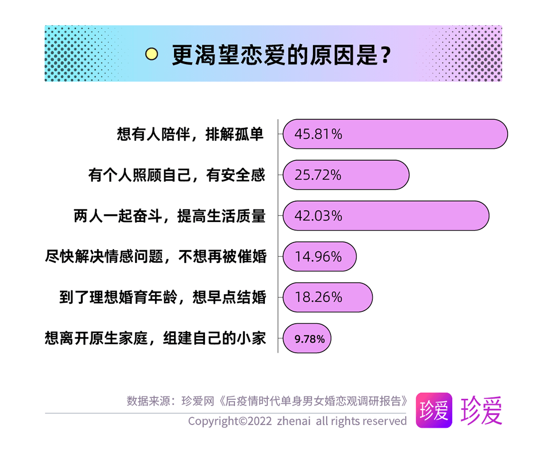 66.54%的單身青年在經(jīng)歷了疫情后更加渴望美好的愛情,希望體驗(yàn)愛與被愛、尋求另一半陪伴、兩人共同努力以改善生活是他們期待脫單的主要原因。年輕人對脫單的期待值有著更顯著的提升,并且是出于更加現(xiàn)實(shí)和理性的考量——20 -35歲的單身青年們渴望脫單的首要原因是希望找到一位與自己并肩奮斗的伴侶,提升生活質(zhì)量;35歲以上的受訪者更注重愛情的感性價(jià)值,把享受愛情、體驗(yàn)愛與被愛放在首位。
