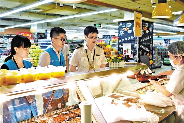 市場監(jiān)督管理局寶安分局沙井所執(zhí)法人員在超市檢查涼菜等。