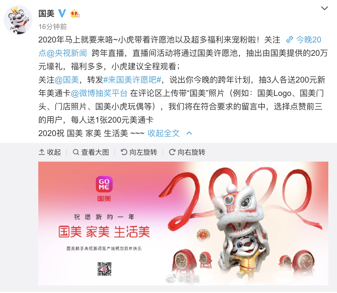 跨年就是要大聲說出你的心愿,趕快@國美幫你圓夢?;顒赢斕?國美官方微博將與央視新聞同步抽獎,2019年12月31日17點起至2020年1月1日不同時間段抽取多項大獎,其中最高獎項為價值2020元國美美通卡1張。