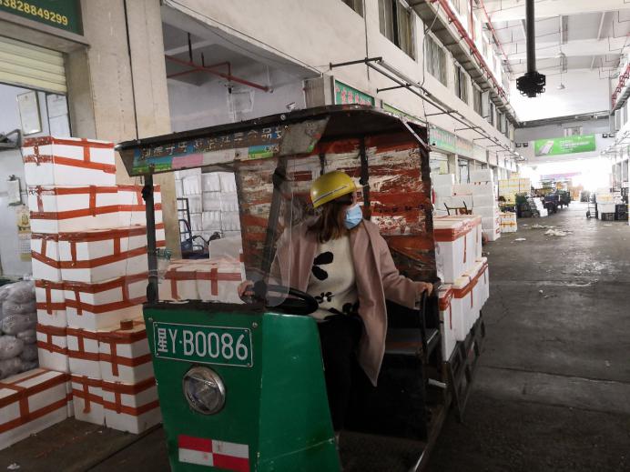 市場(chǎng)的檔主、物流車司機(jī)、加工工人,全部都帶上口罩,看新聞講跟人講話要保持距離,但忙起來(lái)真顧不了那么多,大家都在“搶貨”,這頭跟檔主商量好,那頭貨可能被拉走了?!柏浺阶约旱募庸ぶ行?,才算是你的?!币?yàn)榇汗?jié)批發(fā)市場(chǎng)的檔口工人回去一大半了,沒人送貨,緊張的時(shí)候,有女同事干脆自己借一輛三輪車,把談好的貨源直接拉走。