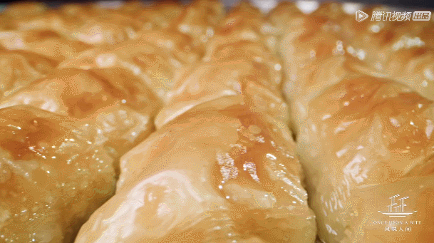 這還沒(méi)到核心。巴克拉瓦最關(guān)鍵的步驟是熬糖,只有資歷最老的師傅才能掌握,溫度、酸度、水、時(shí)間讓糖液達(dá)到平衡,于是,我們看到完美的最后一步: