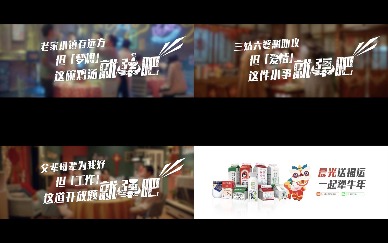 1月29日,晨光乳業(yè)《就犟吧》賀歲TVC微信、朋友圈正式上線,就春節(jié)熱門話題“結(jié)婚、找穩(wěn)定工作、要不要外出追夢”進(jìn)行了生動演繹。在熱鬧喜慶的年節(jié)氛圍中,趣味反轉(zhuǎn)的劇情,形象展現(xiàn)了新一代年輕人對于工作、愛情、夢想“不服輸、敢堅持”的態(tài)度。