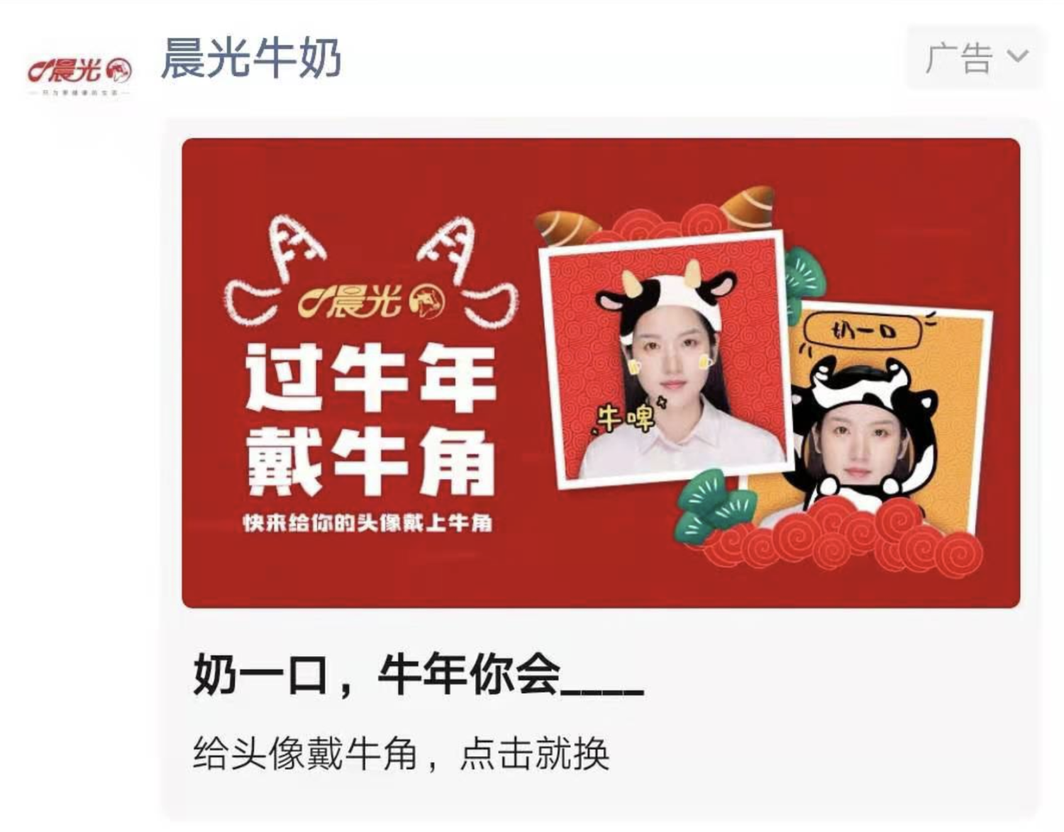 春節(jié),正是各大品牌爭相出招時刻,如何在一眾營銷活動中突出重圍吸引用戶關(guān)注?洞察到用戶在春節(jié)期間“換個喜慶頭像”以及“發(fā)紅包”的強(qiáng)需求,晨光乳業(yè)趣味游戲H5“換個頭像犟牛年”和“定制紅包”于除夕前上線,邀請用戶為現(xiàn)有微信頭像戴上“牛角”。牛角頭像不僅可以用于微信,也可用于其他社交平臺。