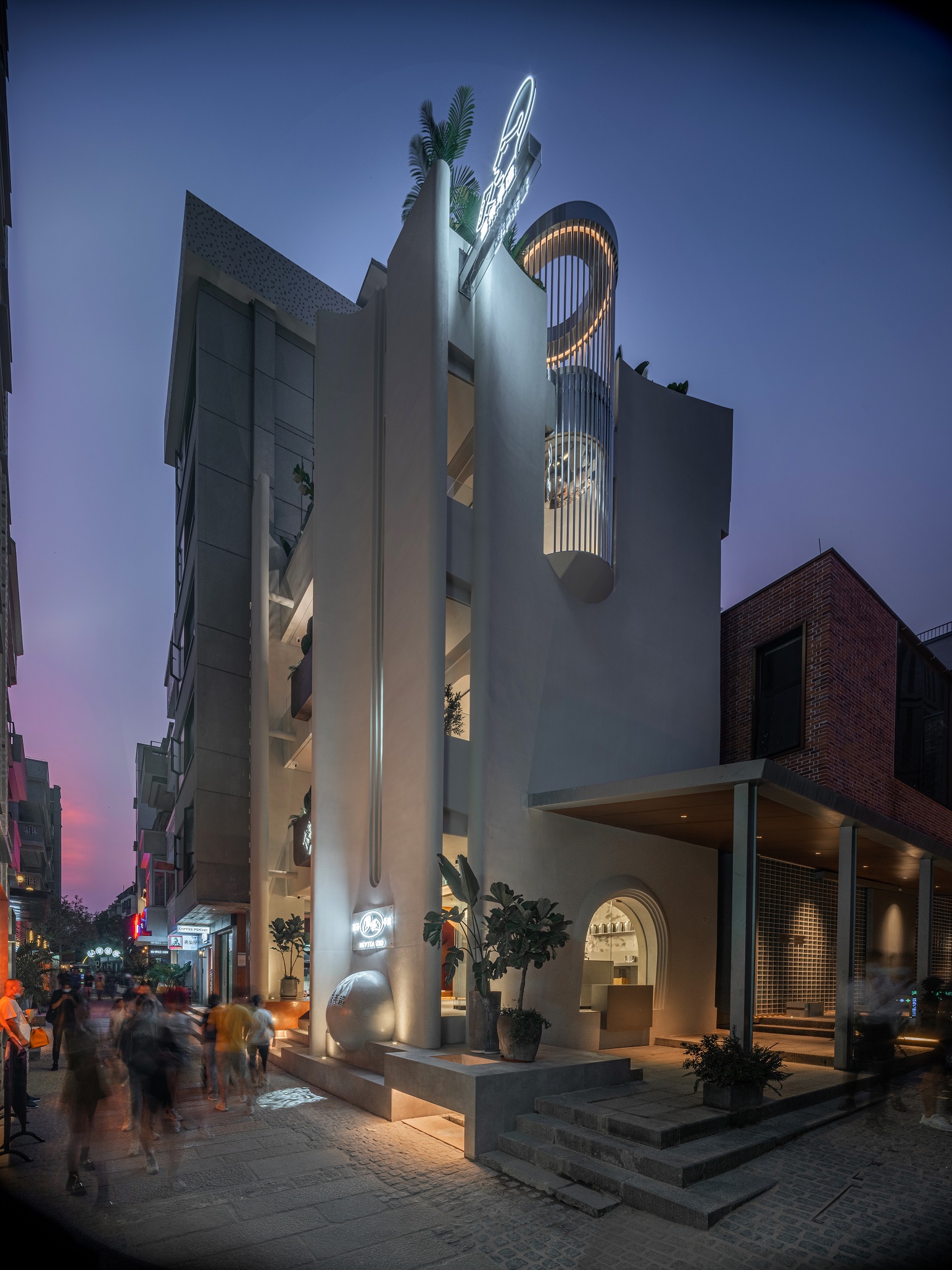 當(dāng)顧客走近門店,店前刻印“喜茶手造”字樣的球狀石塊上方采用水滴狀投影,擬態(tài)自然水滴,展現(xiàn)喜茶天然追求。抬頭望去,二樓走廊花槽采用手鑿銀質(zhì)感材料打造喜茶 Logo,充分突出門店手造特點(diǎn)。