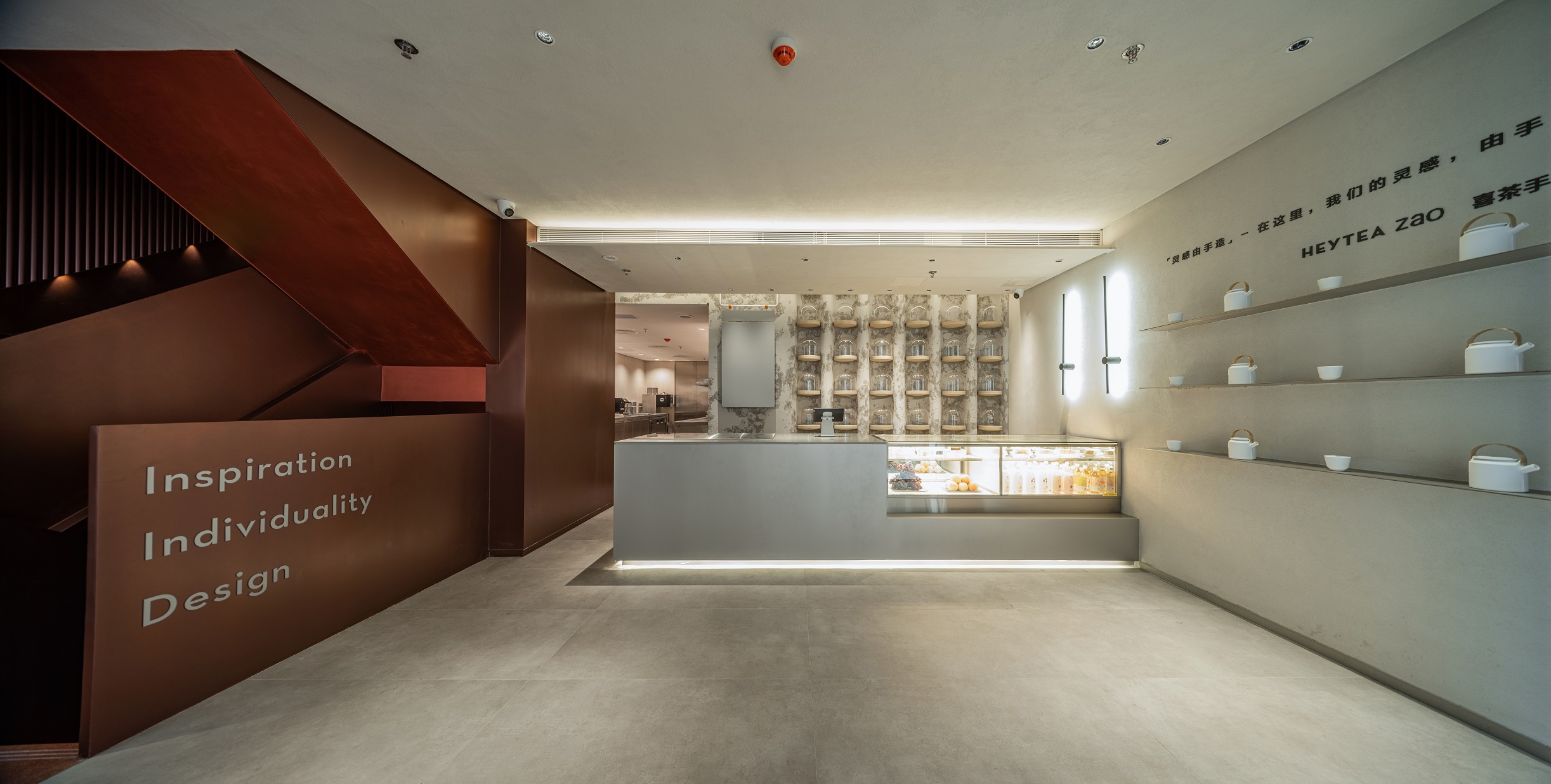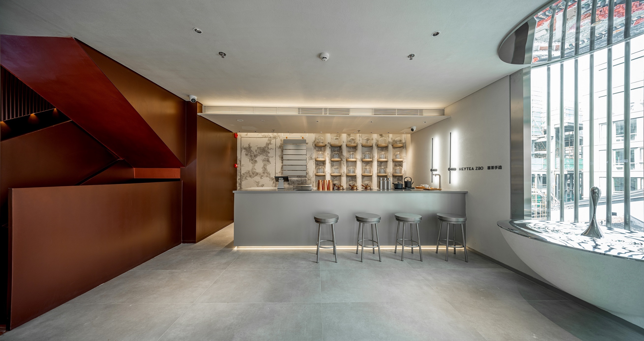 在內(nèi)部設(shè)計上,喜茶同樣以創(chuàng)新的功能空間設(shè)置和突破性設(shè)計,呼應(yīng)每一樓層的手造主題,升級了消費(fèi)者的空間體驗(yàn)。喜茶將一樓正門墻體改造為玻璃移門,塑造出通透的門店空間;變封閉窗戶為開放的門,讓顧客看得見手造產(chǎn)品的全過程。此外,在用色與材質(zhì)搭配上,門店內(nèi)部整體采用嶺南復(fù)古紅與現(xiàn)代極簡白搭配,做舊復(fù)古肌理漆與現(xiàn)代化金屬材質(zhì)呼應(yīng),不僅有效進(jìn)行功能分區(qū),還體現(xiàn)歷史感與現(xiàn)代感的對比、融合。