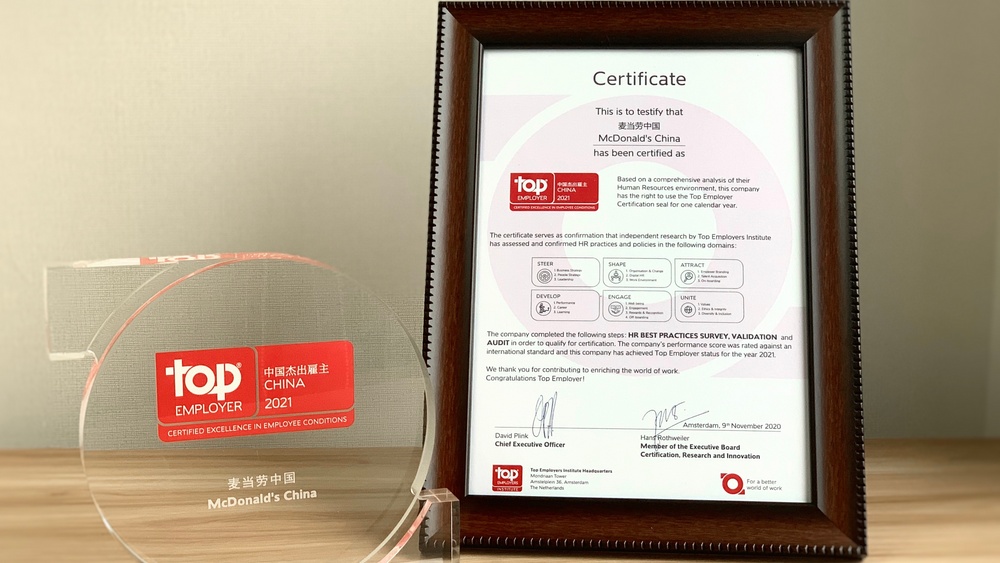 近日,麥當勞中國榮獲杰出雇主調(diào)研機構(gòu)(Top Employers Institute)的“中國杰出雇主2021”認證。