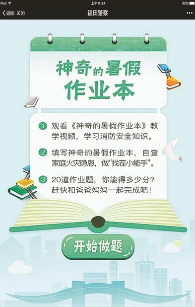 據(jù)介紹,完成這個作業(yè)并不難,只需分三步,第一步是關(guān)注微信公眾號“福田警察”觀看視頻,第二步是掃描二維碼直達《神奇的暑假作業(yè)本》,第三步是在家長陪同下認真完成家庭火災(zāi)隱患排查。當(dāng)然,最重要的是填寫信息欄,將火災(zāi)隱患反饋到后臺?!白鳂I(yè)本”打開后,各種常見的消防隱患會一一展現(xiàn)在眼前。說是作業(yè),它其實更像一個假期實踐,通過生動的視頻和有針對性的問答,取代過去紙質(zhì)版消防安全宣傳冊的作用。