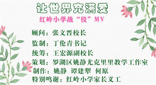 經(jīng)過學(xué)校老師、家長們的共同努力,3月23日,全長6分零6秒的紅嶺小學(xué)戰(zhàn)疫M(jìn)V《讓世界充滿愛》順利完成。該片通過紅嶺小學(xué)微信公眾號(hào)首發(fā),目前,已在深圳晚報(bào)、晶報(bào)、深圳新聞網(wǎng)等多家主流媒體平臺(tái)傳播。