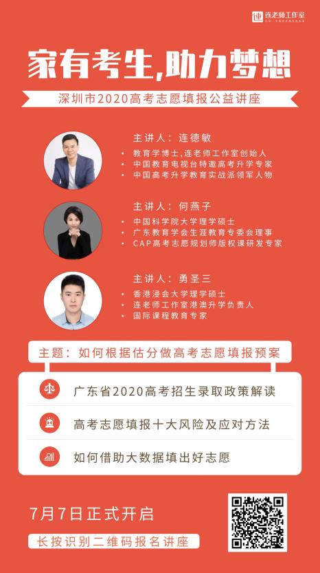 作為此次深圳市2020高考志愿填報公益講座的主辦方,連老師工作室負責人連德敏博士聯合海內外著名教育學者和業(yè)內知名高考升學教育專家,在生涯視角、以“人”優(yōu)先和實戰(zhàn)派三大核心理念下,聚焦于我國高中階段生涯規(guī)劃教育、高考升學規(guī)劃、新高考選科、學業(yè)規(guī)劃的教育研究與咨詢服務,為廣大家長、學生提供高品質高中生涯與升學規(guī)劃整體解決方案。