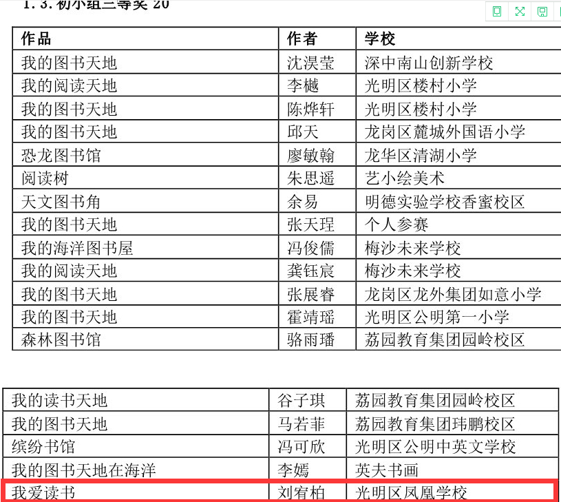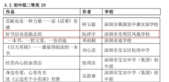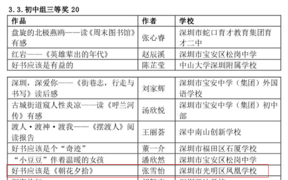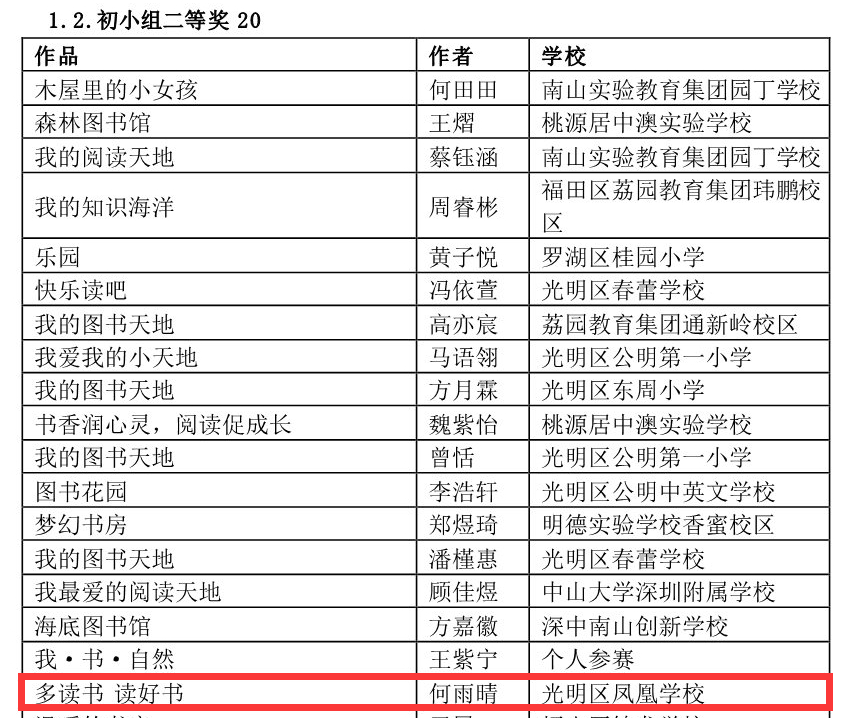 在深圳市4·23世界讀書日“探索閱讀新領(lǐng)域”創(chuàng)作比賽中學校榮獲優(yōu)秀組織獎,何雨晴、劉宥伯同學分別獲初小組二等獎、三等獎;阮澤宇、張雪怡同學分別榮獲初中組二等獎、三等獎。郭瑞芳老師榮獲優(yōu)秀指導老師獎,曾嵽稜、賴美君、李海亮榮獲優(yōu)秀組織老師獎。